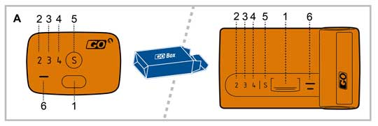 Let hiervoor tijdens de rit op de akoestische signalen van de GO-box. Druk vóór en na de rit korter dan twee seconden op de bedieningsknop en kijk naar de lichtindicatoren.